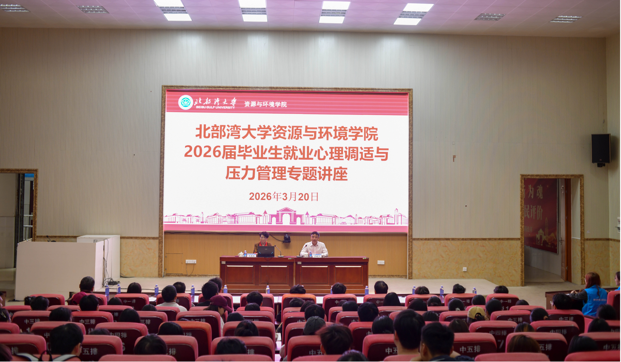 3月20日下午,学院在12-204报告厅举办“从容求职·向阳而行”2026届毕业生就业心理调适与压力管理专题讲座,特邀南宁师范大学龙晓虹博士主讲。学校党委常委、统战部部长,学院党委副书记、院长黎树式主持讲座,毕业班班主任、辅导员、2026届全体毕业生及其他年级有意愿同学积极参加。