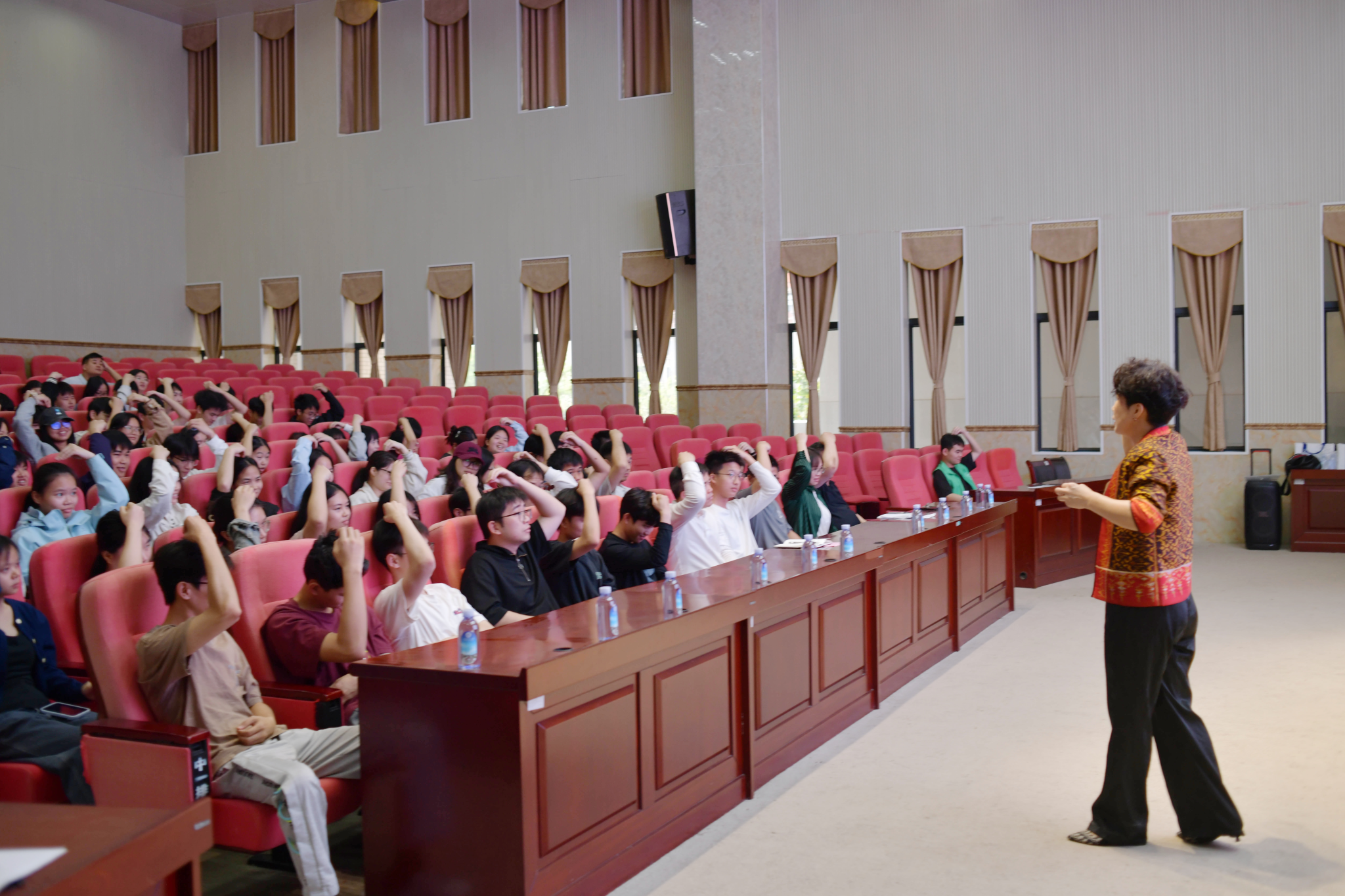 讲座现场,龙晓虹博士立足人工智能时代就业新形势,紧扣毕业生求职现实需求,围绕压力认知、心理调适、面试心态管理等内容展开讲解,并现场示范指导蝴蝶拍、EFT情绪管理等多项实操减压技巧。互动交流环节,同学们就求职心态波动、职业方向抉择等困惑积极提问,龙博士逐一耐心解答,为同学们送上针对性指导。