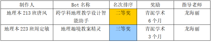 北部湾大学资源与环境学院在全国参赛单位中表现亮眼。由龙海丽老师指导,地理本 213 班唐风同学制作的 “跨学科地理教学设计智能助手” AI智能体荣获二等奖,地理本 223 班周定敏同学制作的 “地理趣境教案精灵” AI智能体荣获三等奖。