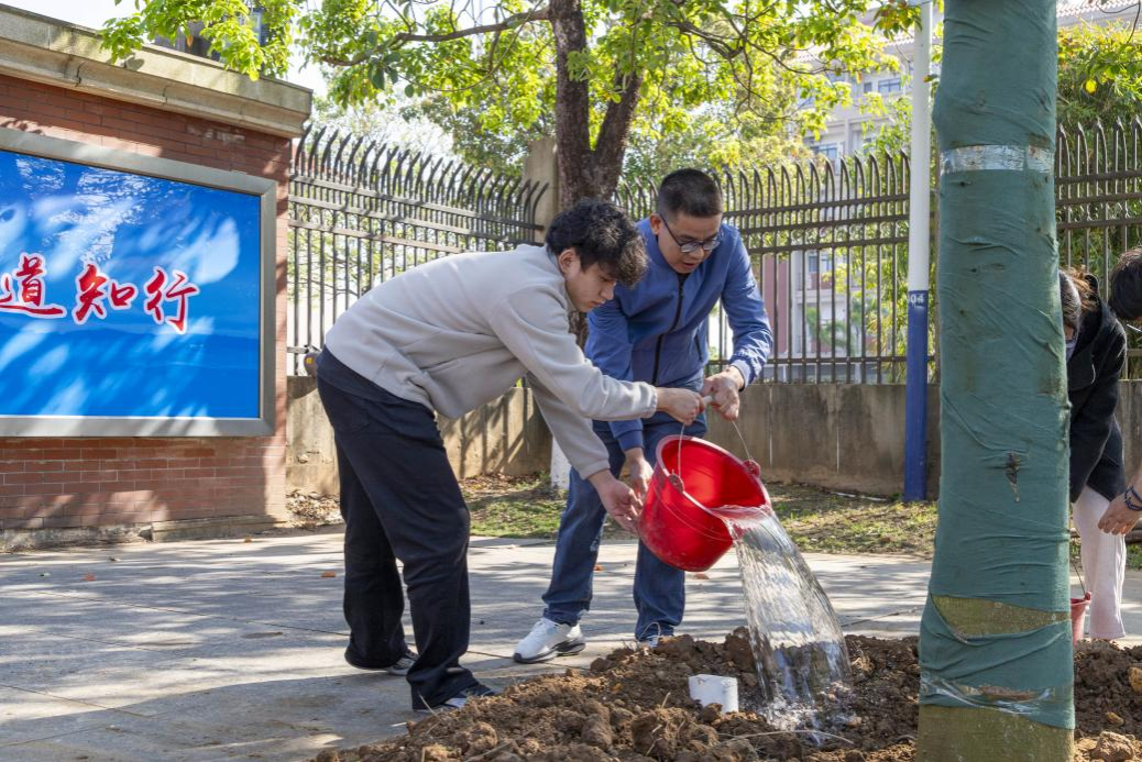 活动现场,师生们在专业技术人员的指导下分工协作、配合默契。大家挥锹铲土、扶苗填坑、围堰浇水,以饱满的热情投入劳动,用双手栽下树苗,也种下了对生态文明建设的美好期盼。