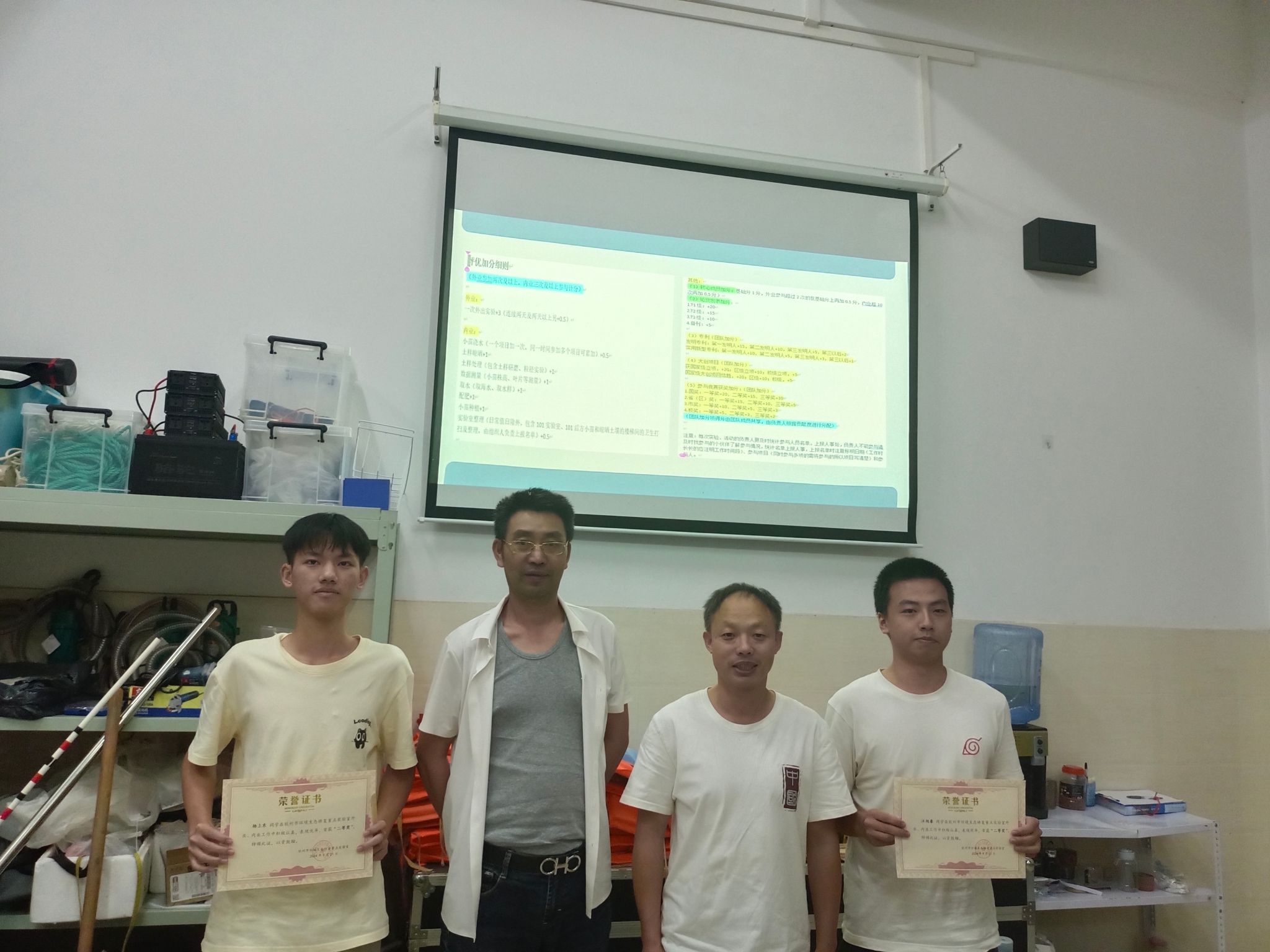 王日明老师(左二)和谢小魁老师(左三)为优秀成员颁奖