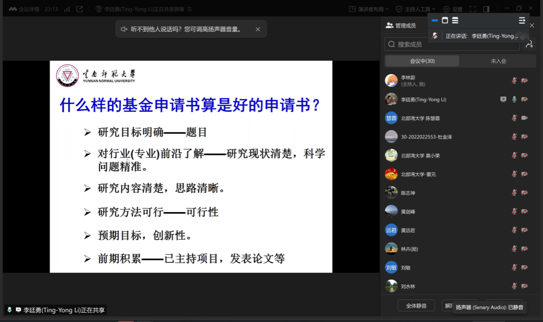 蔡之华教授作了题为《高校教学与科研团队建设的认识与实践》的报告,提出教学团队的建设是提升教师队伍素质、提高教学和人才培养质量的重要举措,科研团队建设可以赋能教学团队的建设,本报告阐述科研促教学、教学育人才、人才助创新这一闭环的达成的路径。李廷勇研究员则就基金申请与论文写作相关问题与师生们进行沟通探讨。