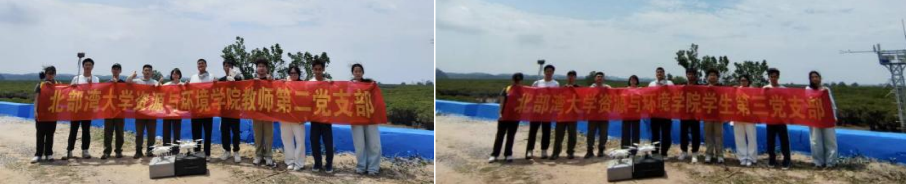 测绘工程专业的同学们利用多光谱无人机,采集了部分红树林多光谱影像数据,该数据将用于红树种类的识别,在实际中增强专业技能。此次专题活动,将专业技能与党建实践紧密结合,让党员们在沉浸式学习中增强专业、知识,为钦州河口红树林的修复贡献一份力量。
