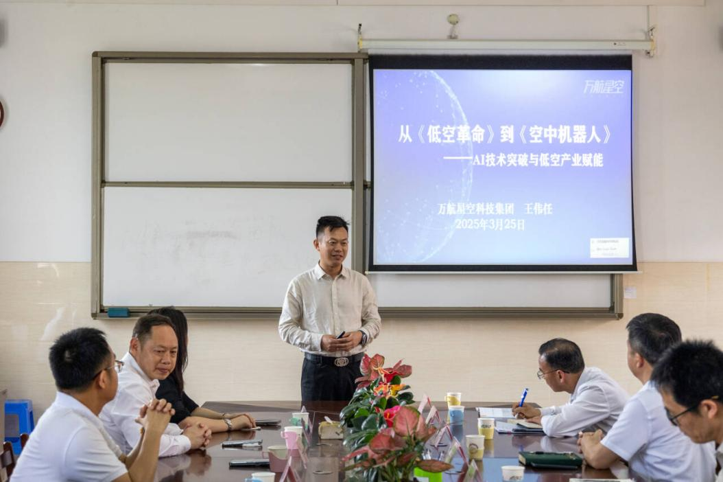 2025年4月17日,万航星空科技集团有限公司董事长王伟任一行到访学院,开展以“从《低空革命》到《空中机器人》:AI技术突破与低空产业赋能”为主题的宣讲会。学院院长黎树式及相关专业教师、学生代表共同参会。