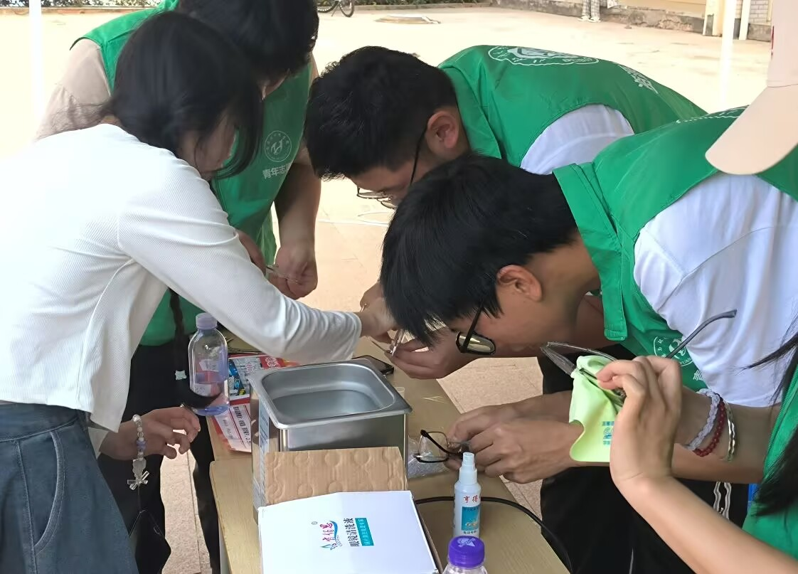 活动当天,晨曦微露,志愿者们早早抵达现场,有条不紊地布置好服务展位,精心准备了超声波眼镜清洗仪等专业工具,热情接待前来咨询的每一位师生,展现出良好的精神风貌。在志愿服务过程中,志愿者们细致入微地为同学们清洗眼镜,耐心调整镜架松紧,还贴心地为师生提供免费的镜片和镜布。活动现场井然有序,吸引了众多同学前来参与。