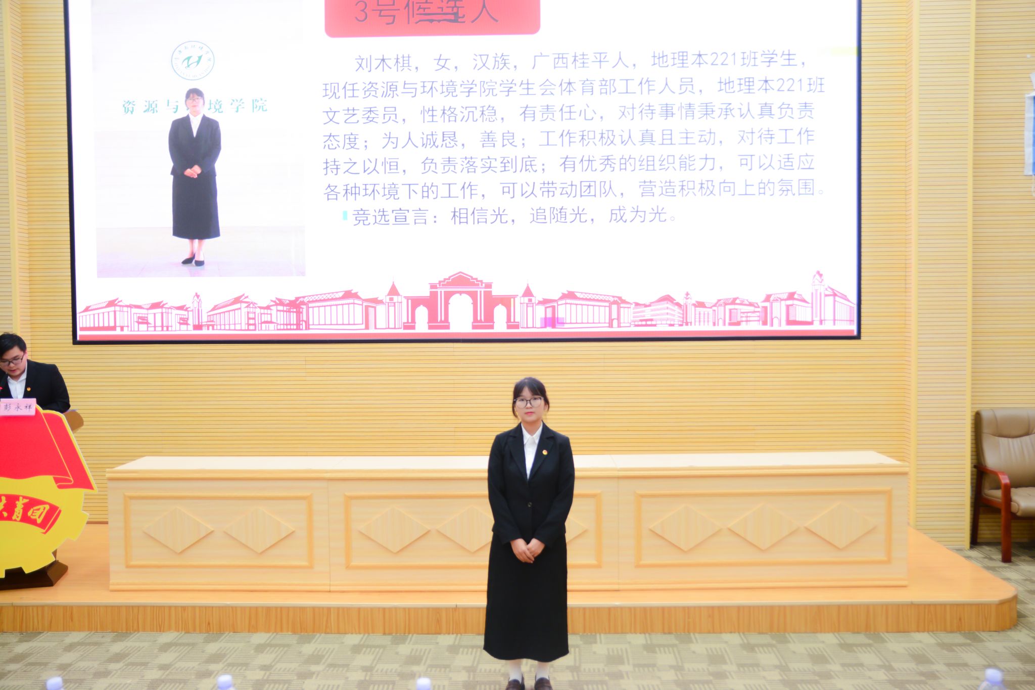 会议全票通过共青团资源与环境学院第一次代表大会选举办法、资源与环境学院第六届学生代表大会选举办法等文件后,候选人依次进行竞选演讲,表达自己对学生工作的热爱及未来规划。大会选举环节,由团员代表、学生代表分别投票选举共青团资源与环境学院第一届委员会委员及资源与环境学院第六届学生会主席团成员。